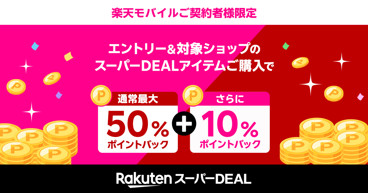楽天モバイルご契約者様限定!エントリー&対象のスーパーDEAL対象アイテムをご購入で+10%ポイントバック!「楽天スーパーDEAL」は、楽天会員様限定の高ポイント還元サービスです。