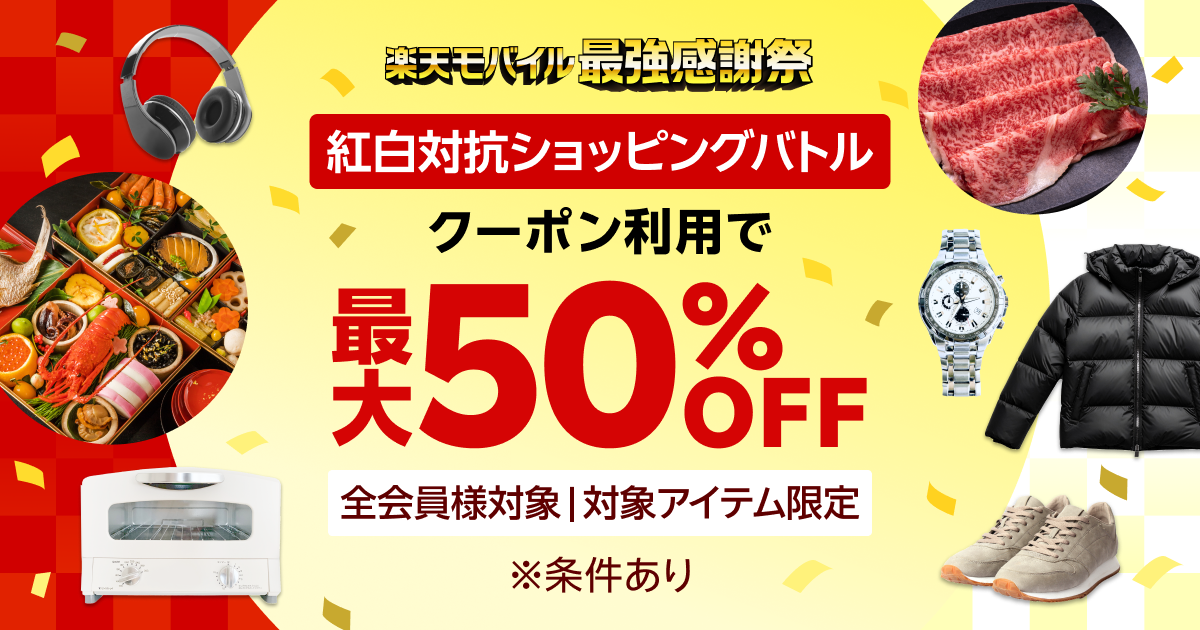 【楽天モバイル最強感謝祭】紅白対抗ショッピングバトル 最大50%OFFクーポンも!