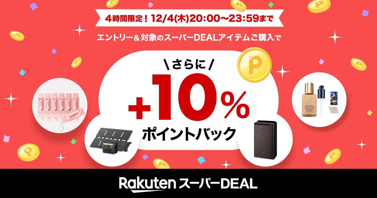 【楽天市場】楽天スーパーDEAL|4時間限定!エントリー&対象のスーパーDEALアイテムをご購入で+10%ポイントバックキャンペーン