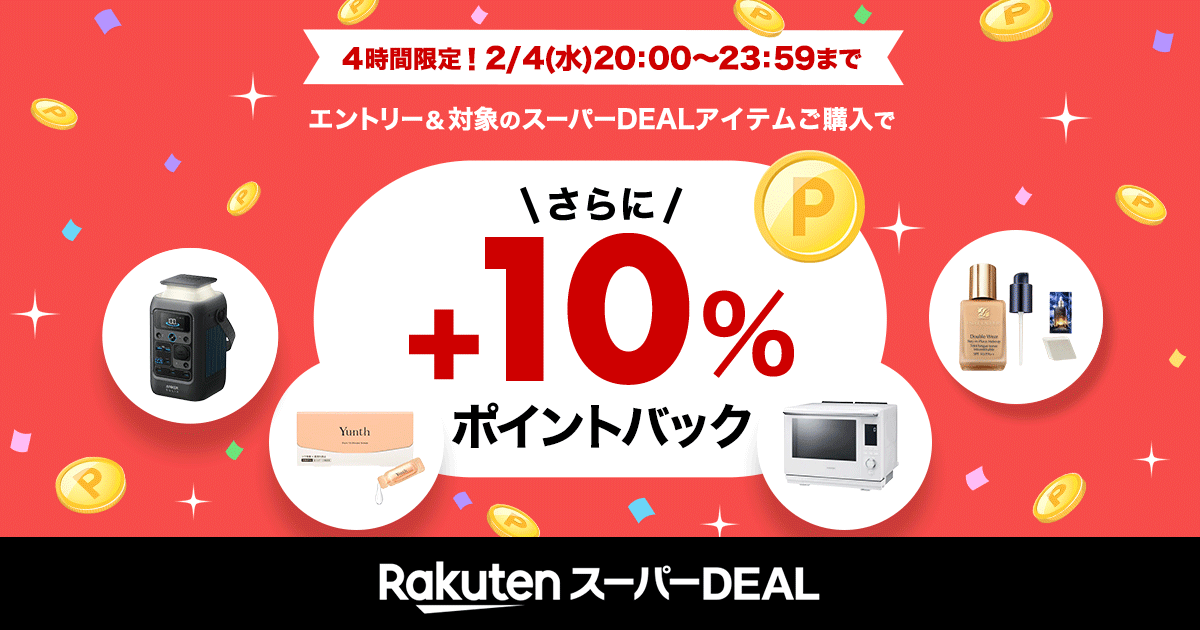 4時間限定!エントリー&対象のスーパーDEALアイテムをご購入で+10%ポイントバック!「楽天スーパーDEAL」は、楽天会員様限定の高ポイント還元サービスです。