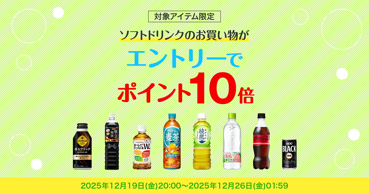 水・お茶飲料・ソフトドリンク・コーヒーがお買い得!大感謝祭期間中にエントリー&対象商品のご購入でポイント10倍!毎日飲むドリンクをお得に、お手軽に購入しましょう!