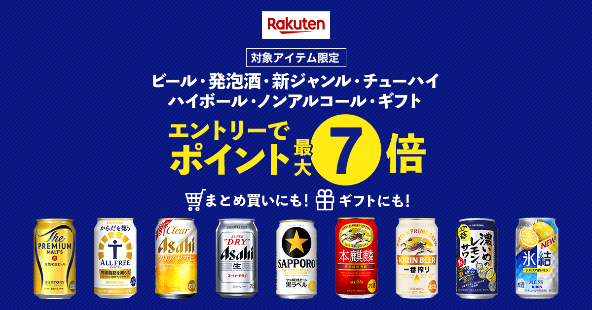 本麒麟・のどごし生・クリアアサヒ・黒ラベル・氷結などのビール・発泡酒・新ジャンル・チューハイ・ハイボール・ノンアルコール・ギフトのポイント最大7倍キャンペーン実施中!楽天市場で美味しいお酒をお得にGET!