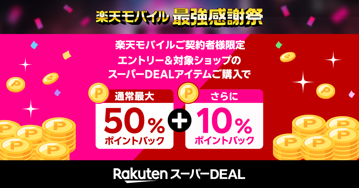 楽天モバイルご契約者様限定!エントリー&対象のスーパーDEAL対象アイテムをご購入で+10%ポイントバック!「楽天スーパーDEAL」は、楽天会員様限定の高ポイント還元サービスです。
