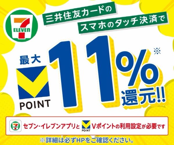 条件達成のうえで、セブン‐イレブンで、スマホのVisaのタッチ決済・Mastercardタッチ決済で支払うと、最大11%ポイント還元!
